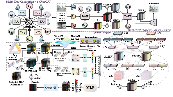 该研究工作利用视觉-语言大模型从不同视角对多源图像生成适用于共性特征和异性特征分解的多文本描述,并针对多源图像构建了文本性标签。工作以传统流形-等势域变换技术为基础,提出一种从图像域到文本域的特征变换方法,实现了对视觉特征图的多语义引导与图像-文本的高度对齐,成功应用在红外-可见光图像融合与医学图像融合任务并实现先进的性能,此外可提升目标检测、医学图像分割等多个下游任务的性能。