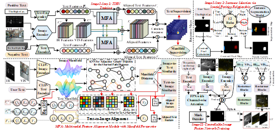 1.王泽宇博士在计算机视觉领域中多源图像融合研究上,针对现有红外与可见光图像融合方法缺乏可控性、难以满足用户个性化需求问题,提出一种弱监督的实例级可控融合模型,可依据输入文本自适应地突出用户关注的目标。模型包括伪标签生成与融合训练两个阶段:第一阶段通过多模态流形先验,引导文本响应网络从实例分割结果中识别与文本匹配的目标对象,并结合空间位置信息提升准确性;第二阶段利用伪标签指导融合网络对目标与非目标区域采用差异化策略。实验表明,该方法在融合质量和可控性方面表现出色,并在下游任务中取得优异效果。其研究工作受到评审专家高度评价,评审专家认为提出的范式能够有效推动多源图像融合领域的发展。