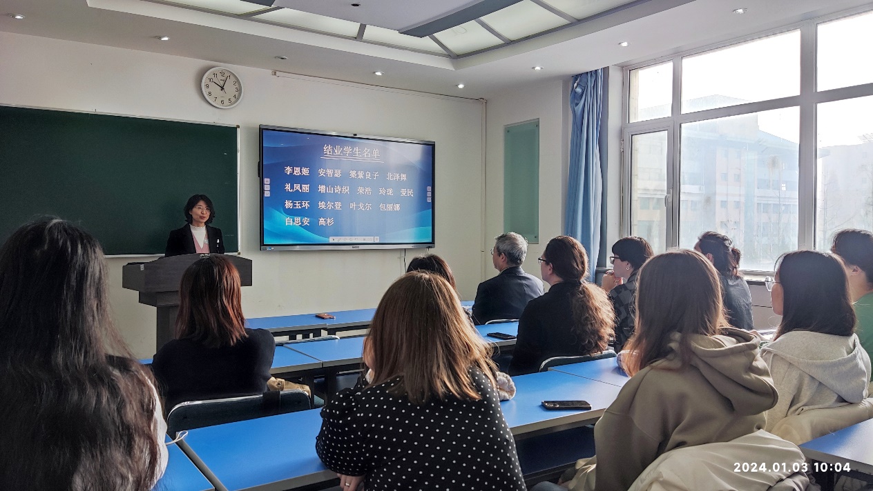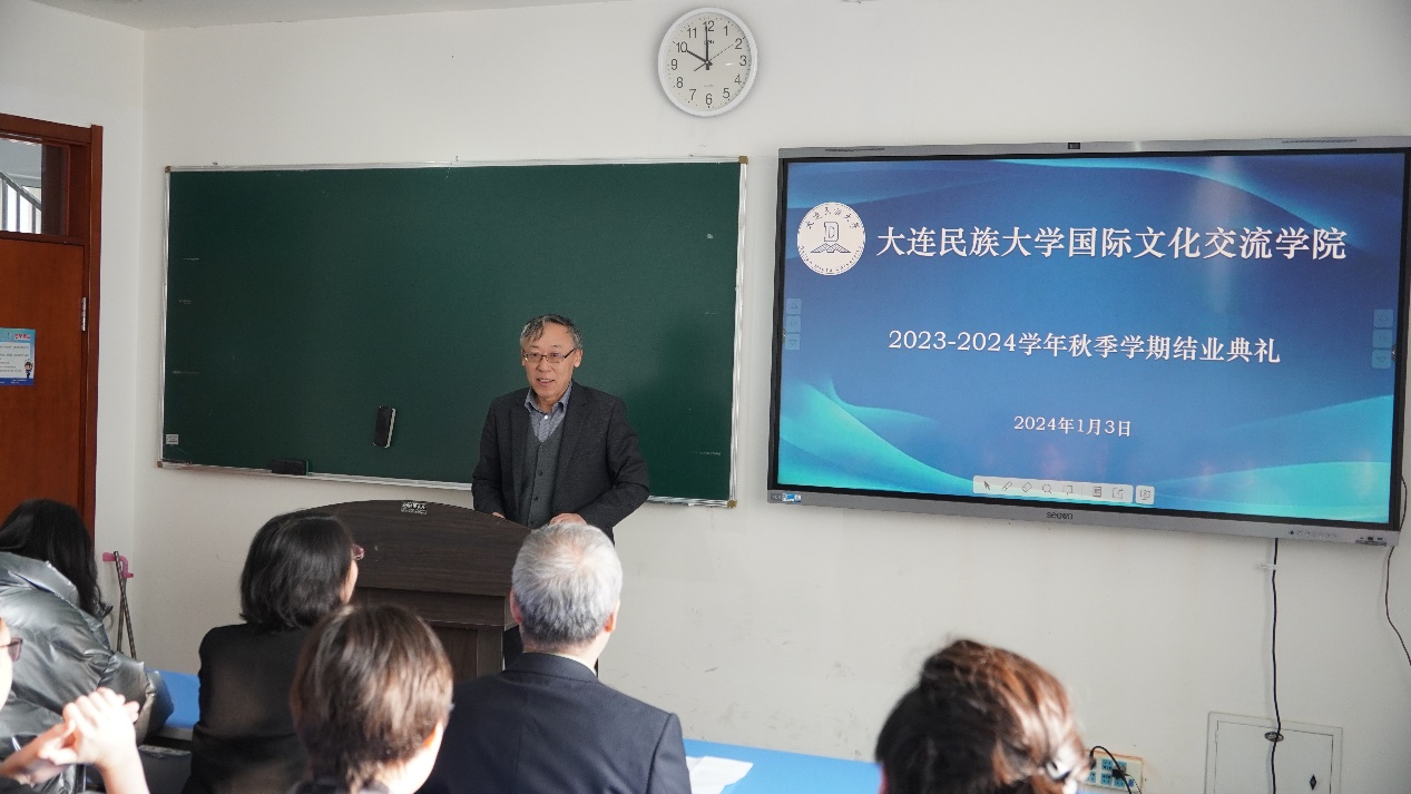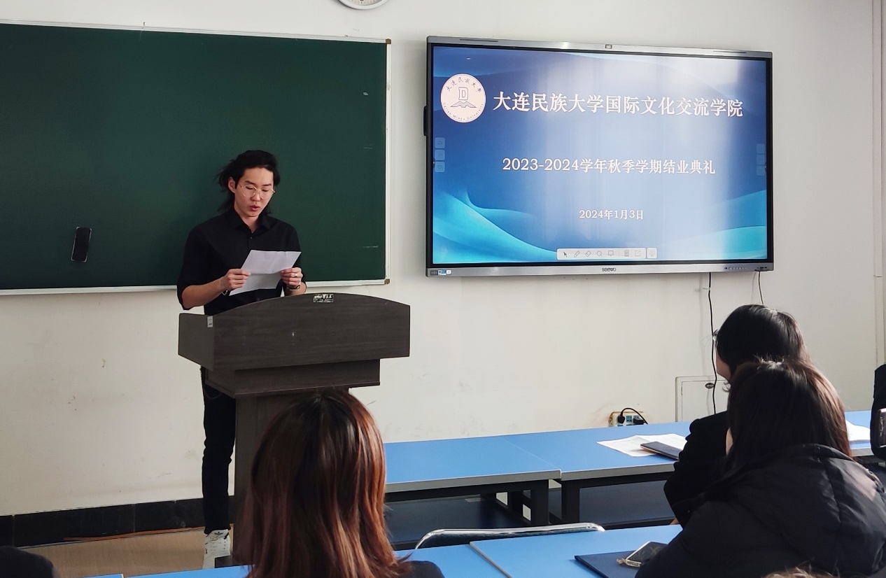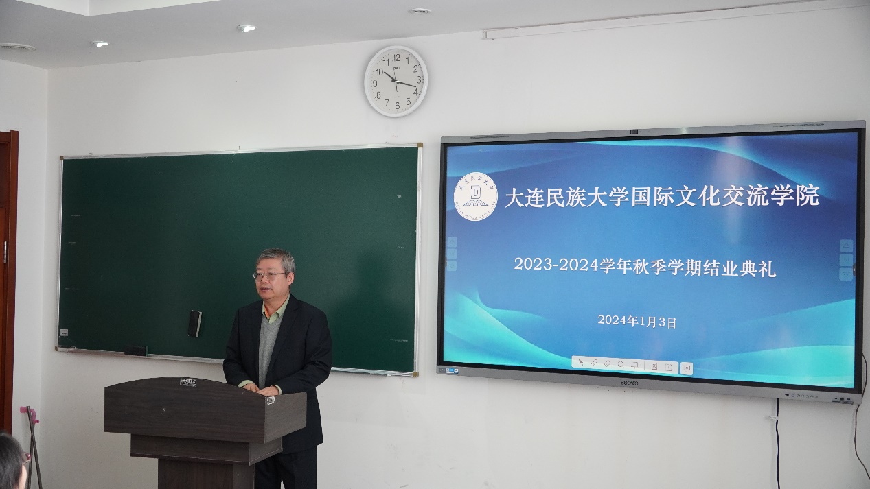 1月3日,国际文化交流学院举行2023-2024学年秋季学期结业典礼,学院领导班子成员、任课教师、学生工作者出席典礼,18名留学生参加了典礼。典礼由国际文化交流学院副院长刘俊民主持。