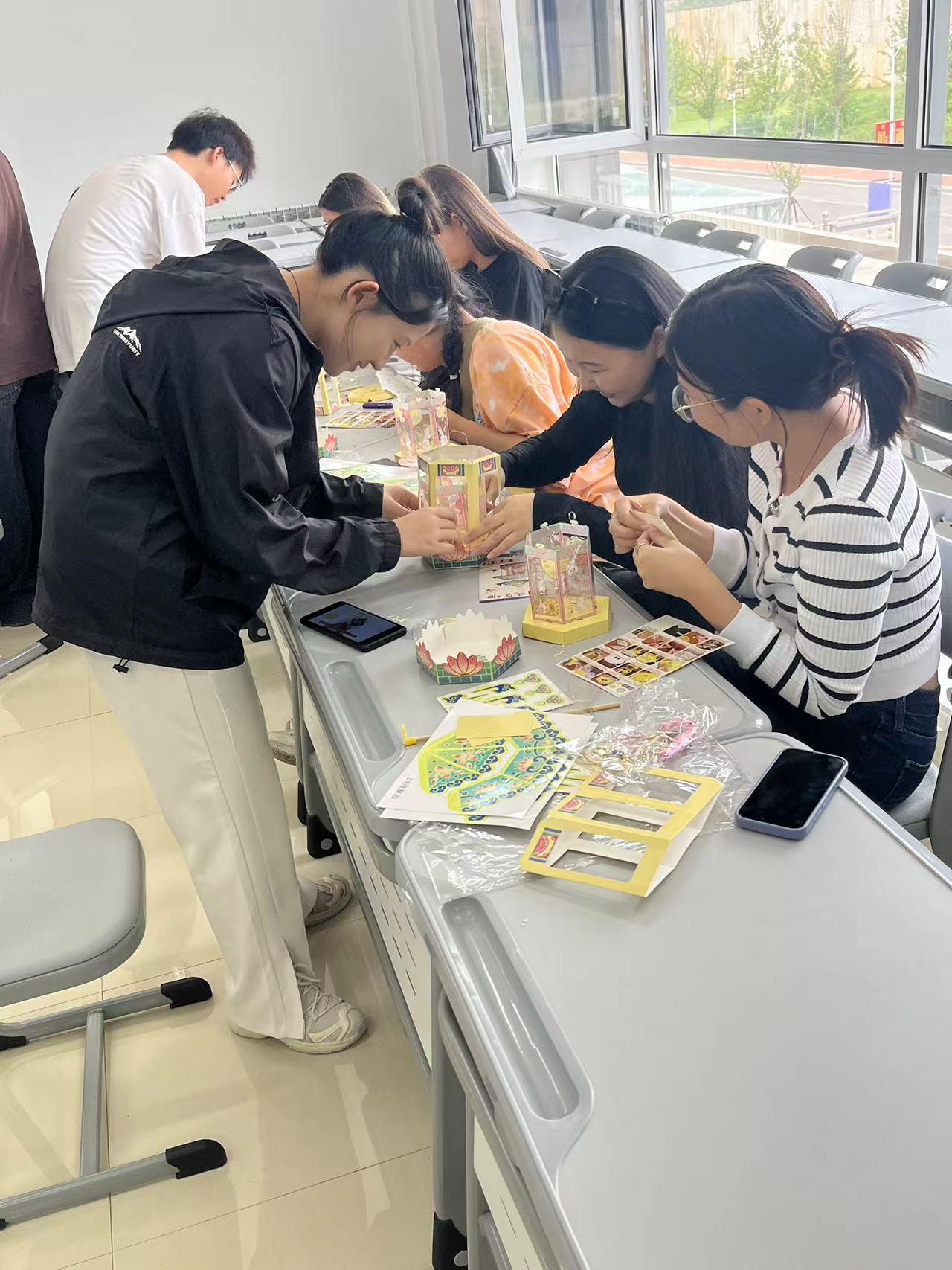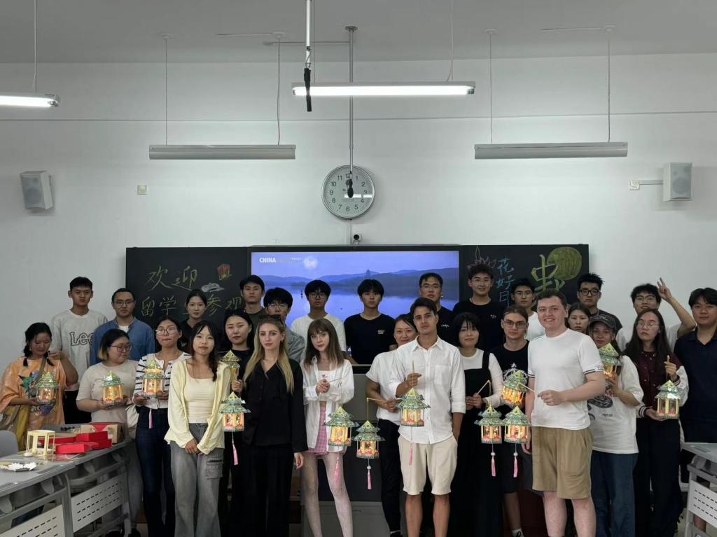 在鼎新楼教室里,我国古代中秋传统宫灯制作正在热火朝天进行。对接班级同学代表向留学生介绍了中秋节的历史、习俗和文化内涵,跟留学生们一起进行古代中秋传统宫灯制作。在一片欢声笑语中,大家交流制作心得,体验中秋文化。