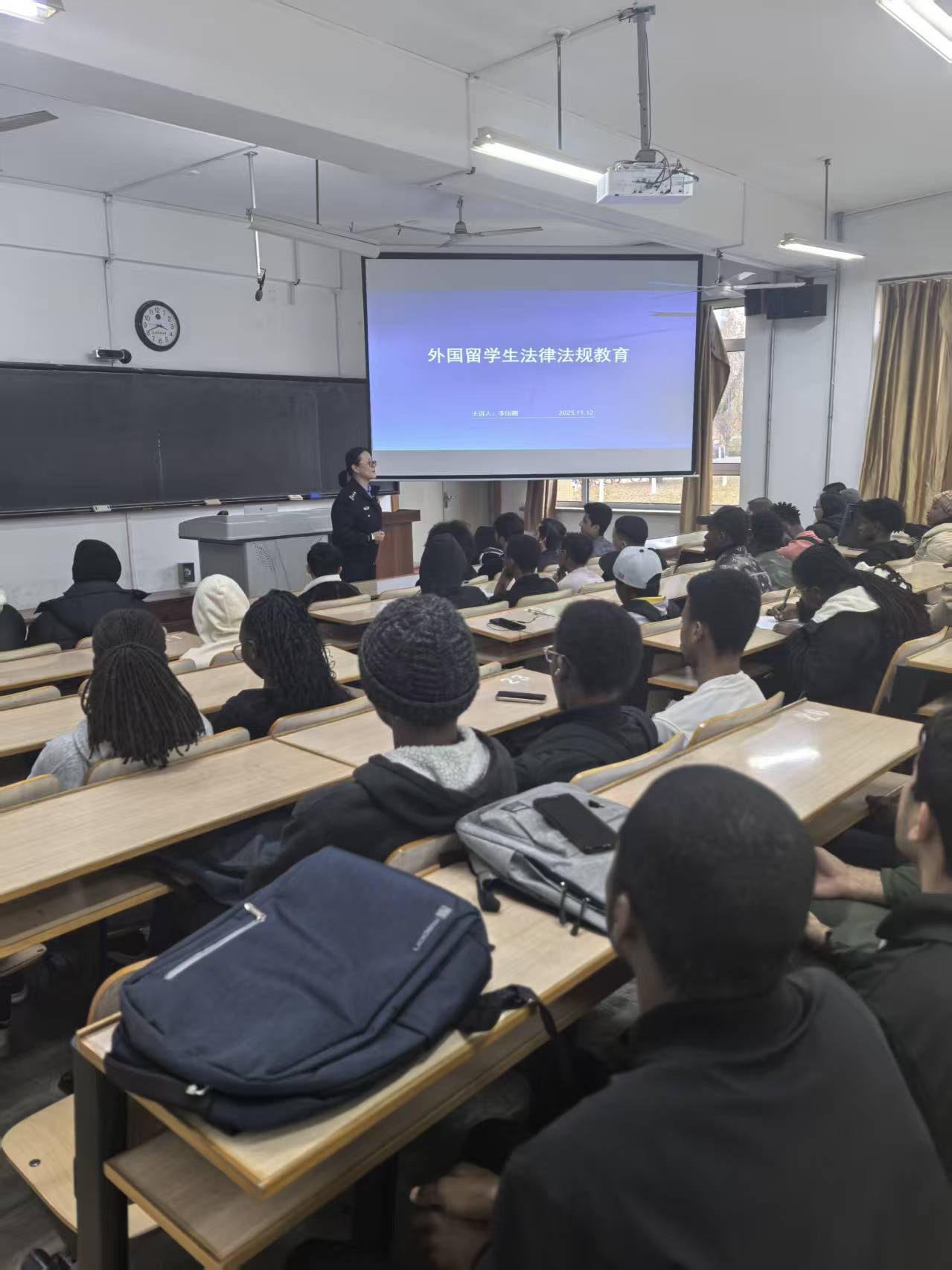 为增强来华留学生的法律意识与安全防范能力,保障其在华学习生活安全、有序进行,11月12日,国际文化交流学院邀请大连市公安局开发区公安分局黄海路派出所李国霞警官为在校来华留学生举办了一场内容丰富、案例生动的法律法规与安全教育专题讲座。全体来华留学生参与了此次学习活动。