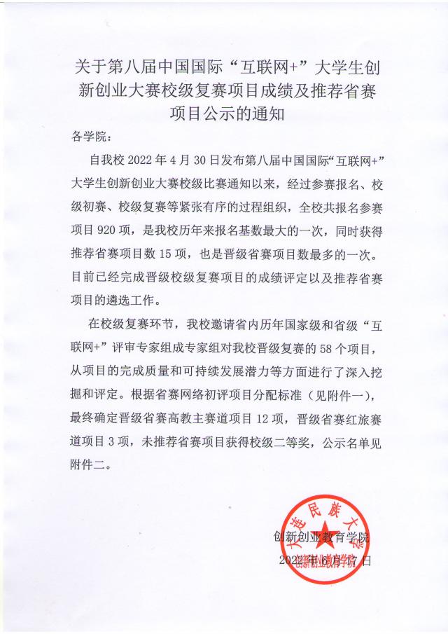 关于第八届中国国际“互联网+”大学生创新创业大赛校级复赛项目成绩及推荐省赛项目公示的通知