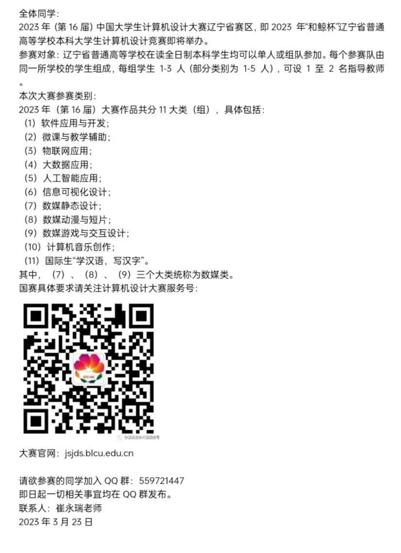 关于举办2023年(第16届)中国大学生计算机设计大赛bat365中文官方网站选拔赛的通知