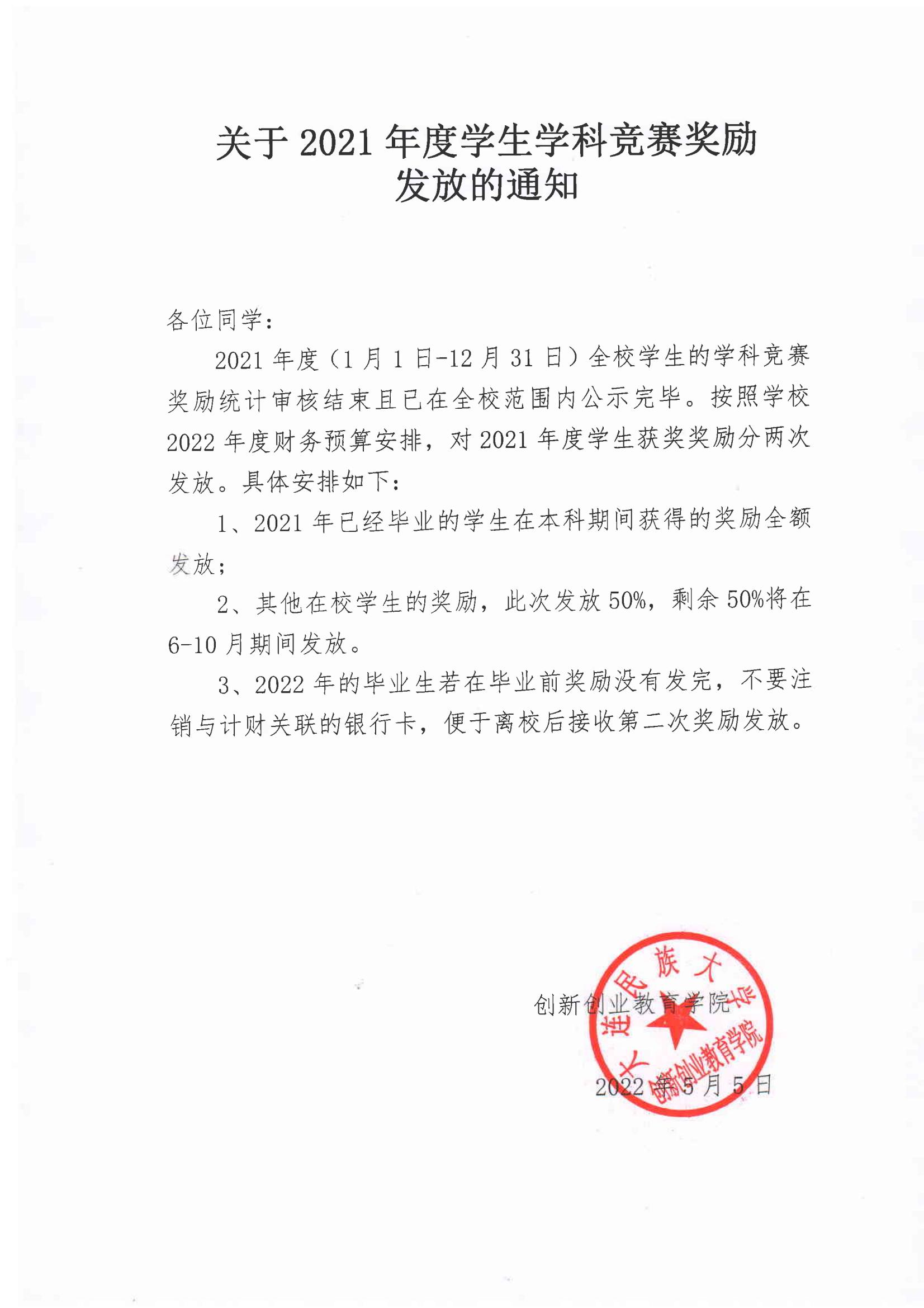 关于2021年度学生学科竞赛奖励发放的通知