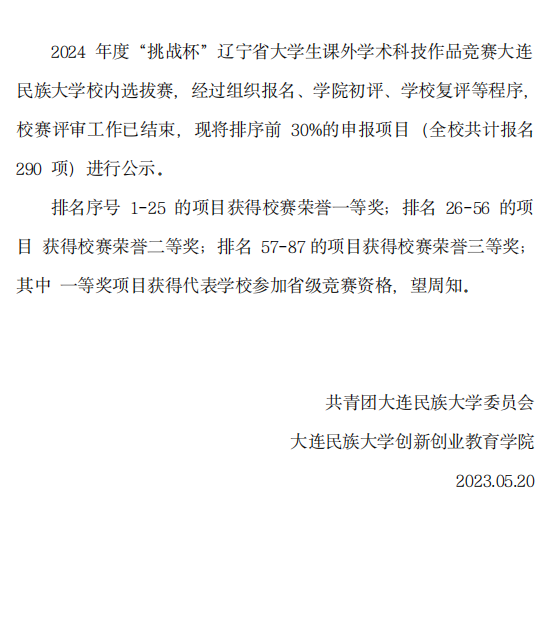 2024 年“挑战杯”辽宁省大学生创业计划竞赛 bat365中文官方网站校内选拔赛成绩及晋级名单公示
