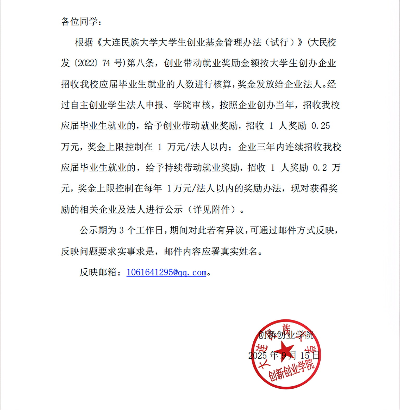 关于 2025 年度大学生自主创业带动就业奖励结果公告