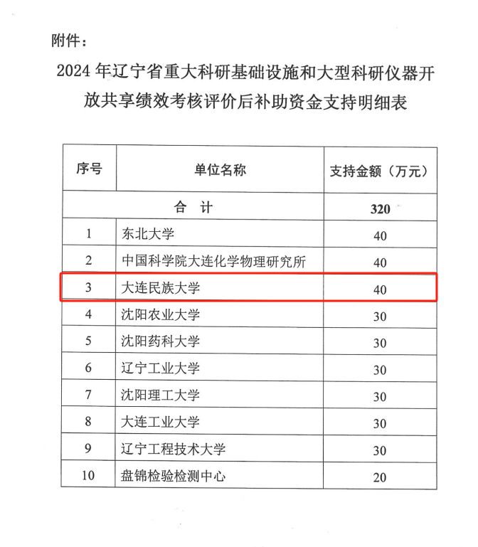 民大新闻网讯 近日,辽宁省发布了《关于下达2024年辽宁省重大科研基础设施和大型科研仪器开放共享绩效考核评价后补助资金的通知》,bat365以全省第3名的优异成绩获评“优秀示范单位”。获得最高等次后补助资金40万元,全省仅10家单位获得后补助资金支持。至此,bat365自2020年以来累计获得后补助资金支持共计65万元。