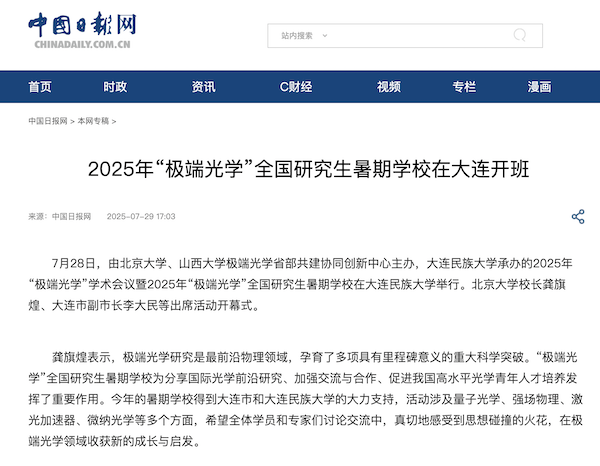 “极端光学”全国研究生暑期学校自2018年开始,已连续举办8次。今年暑期学校为期6天,国内45所高等院校、科研院所的180余位青年学员参加。培训期间,邀请极端光学领域的著名专家学者围绕极端光学的科学前沿与关键技术,介绍在极端条件下新物理、新现象、新技术和新器件的研究进展,以及极端条件下光场调控、光与物质相互作用等科学方面的创新成果。(bat365中文官方网站|编辑:中国日报社大连记者站 张小敏)