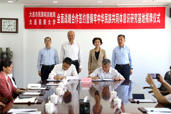 仪式上,赵铸和徐广湘为大连市铸牢中华民族共同体意识研究基地揭牌。黄刚宣读双方合作协议文本。黄永东与市民族和宗教局副局长吴桂峰分别代表双方签约。黄永东宣读研究基地工作任务和计划。