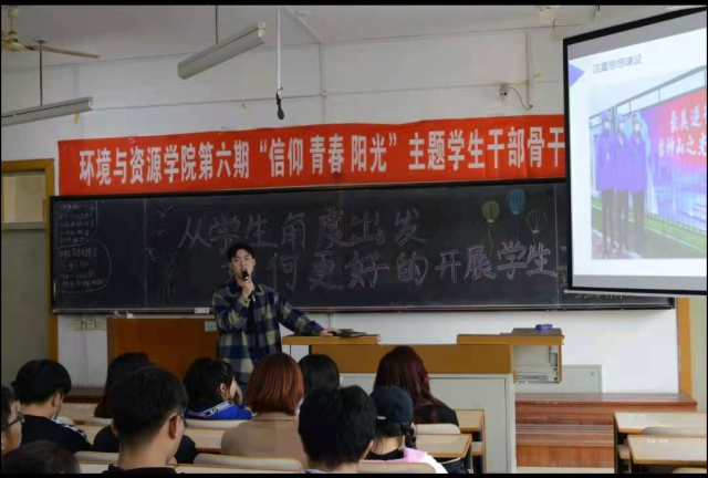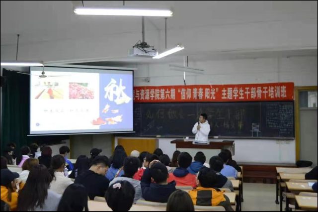 第五次骨干培训由环境与资源学院辅导员万博一老师主持,主要对学生干部进行培训,让学生干部意识到自己肩上的责任。她认为青年学生要有理想,有作为,敢担当,为同学们起好头,做好表率作用。