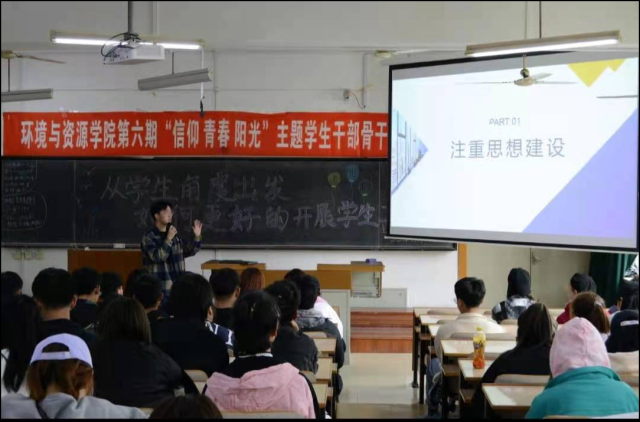 学生干部是学生群体的骨干,是学院学生工作的最前端。为进一步加强学生干部队伍建设,提高学院学生干部的综合素质和工作能力。经过为期一个月的学生干部培训,环境与资源学院第6期“信仰·青春·阳光”主题学生骨干培训班已经圆满结束。此次培训班旨在提升学生干部政治理论素养和工作业务能力,增强团队凝聚力。
