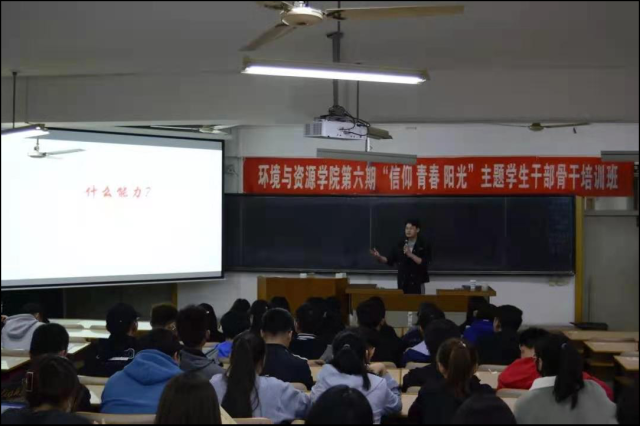 第三次骨干培训由环境工程系主任冉春秋老师主讲。以学习为主线进行讲解,举例说明了学习对未来工作、考研的重要性。他强调,作为学生干部,大家要在学习和生活中严格要求自己,起好模范带头作用。