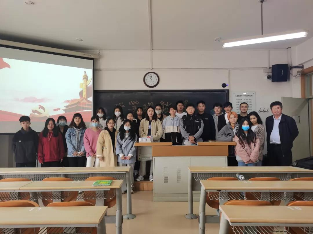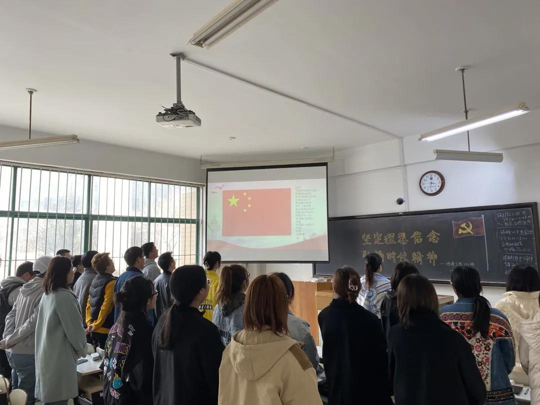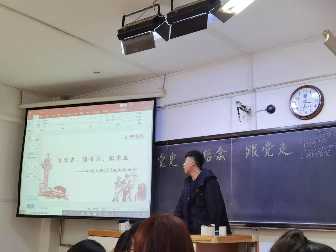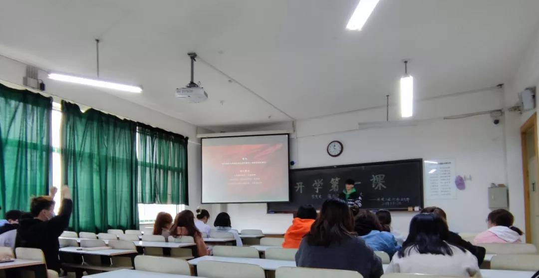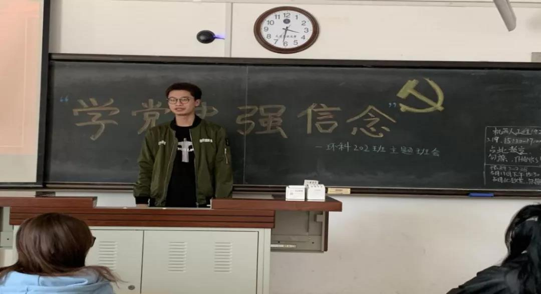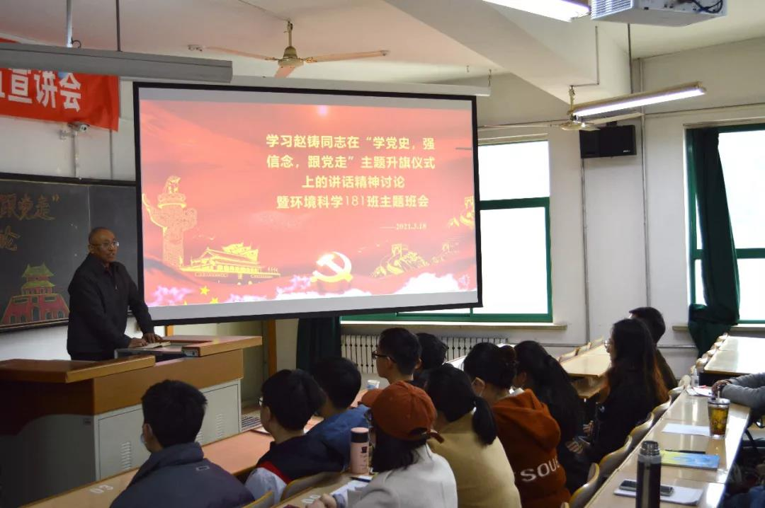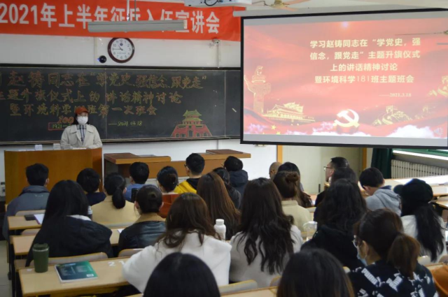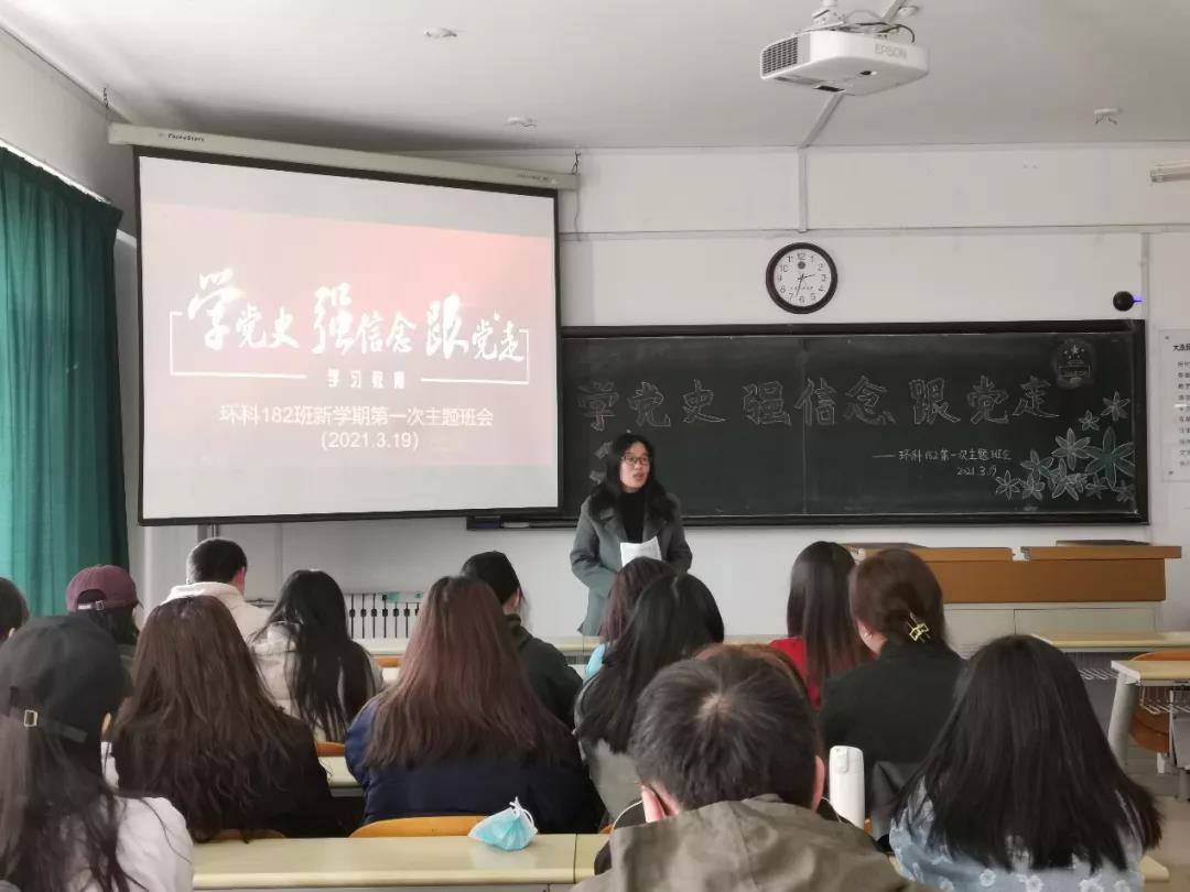环境科学181班在2-201召开学习学校党委书记赵铸同志在“学党史、强信念、跟党走”主题升旗仪式上的讲话精神讨论暨环境科学181班第一次班会。班会由班长王靖涵主持召开。班会邀请了环境与资源学院党总支书记兼班级辅导员李华戎老师及班导师宋彦涛老师。首先,全体起立合唱国歌;班长王靖涵介绍班会主要内容并播放短视频引入班会;团支书张倩分享赵铸书记讲话以及个人观点;刘馨泽、李晓婷、杨若祎等6位同学(囊括积极分子、发展对象、班委等)借此班会分享个人党史学习心得以及高效学习方法和对学校疫情防控工作的看法;之后班导宋彦涛老师点评此次班会并给予同学新学期新希望;最后书记李华戎老师对班会内容进行了总结,并就党史学习与同学们进行分享,给予同学们信心与期望。