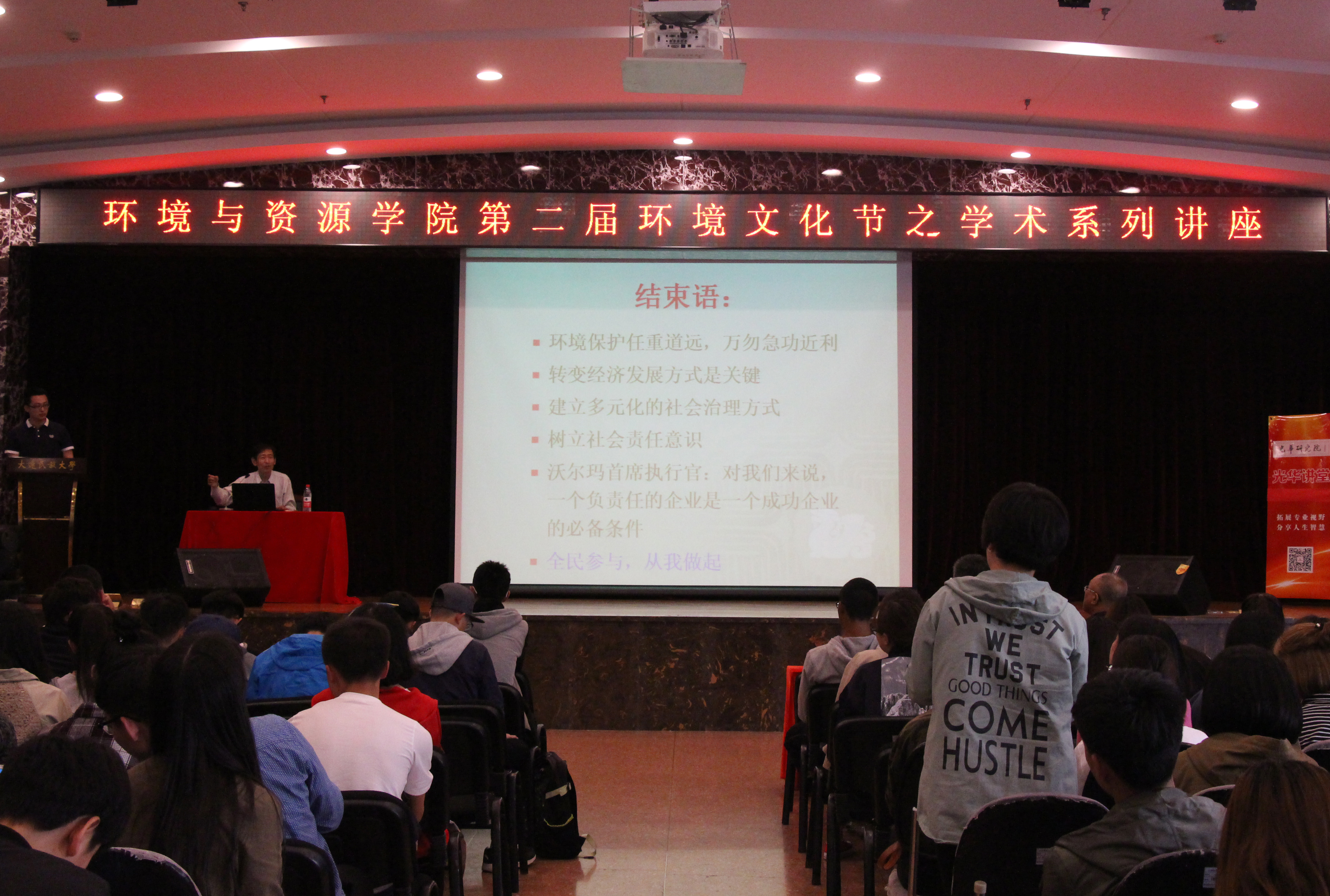 民大新闻网讯 5月9日,环境与资源学院举行第二届“环境文化节”之学术系列讲座,环境与资源学院邀请国家环境保护部原总工程师、政策法规司司长杨朝飞教授,做关于绿色经济与生态文明的报告。环境与资源学院院长吕国忠、党总支书记李华戎、环境工程专业系主任陈兆波、班导师代表、全体学生工作者、学生党员、团学干部代表及2015级、2016级全体学生参加此次报告会。