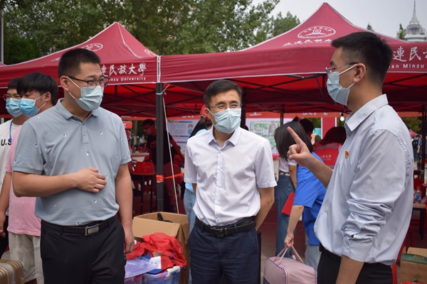 在开发区校区迎新现场,赵铸详细询问了新生人数、报到程序等,对工作人员的辛勤付出表示感谢,要求各学院各部门要以学生为本,提供人性化服务,让新生真切感受到来自大连民大这个大家庭的关爱和温暖。要积极回应新生及家长最关切的问题,着力解决新生入校后遇到的实际困难。赵铸还亲切地对因为疫情防控不能进校的家长们说:“大连民大的校风教风学风是最好的,把孩子送到这里请你们放心,我们会把每名学生都当成自己的孩子一样对待。”