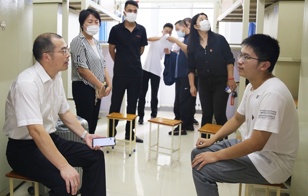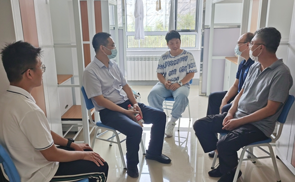党委书记赵铸来到7号公寓信息与通信工程学院学生宿舍,与同学们亲切交谈,了解家乡及家庭情况,询问专业及入校感受等。他主动与同学们互留微信,勉励大家珍惜大学时光,刻苦学习知识,做好人生目标规划,继承和发扬“学在民大”的优良学风,在新的环境中团结同学,勤奋学习,健康成长,争做担当民族复兴大任的时代新人。赵铸说道:“来大连民大攻读大学是最正确的选择,学校以铸牢中华民族共同体意识为主线,加强民族团结,各族师生团结友爱,互帮互助,这里就是一个温暖的家,我们都是这个大家庭里的一员,无论在学习上还是生活上遇到困难,都要及时向学校和老师寻求帮助,我们会想办法解决的。”