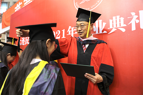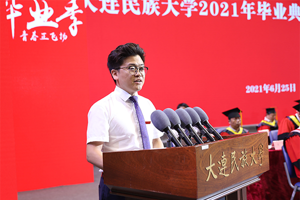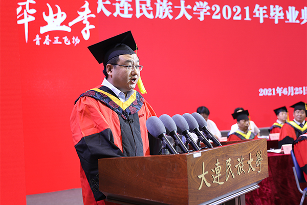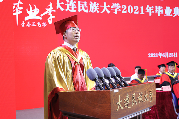 丁克毅回顾了四年来学校发展建设取得的成绩,以及同学们践行“学在民大”,用实际行动展现“为中华民族伟大复兴而读书”的时代新人风采,为同学们的优异表现点赞。他寄语全体毕业生,今年是建党100周年,我们即将迎来党的百年华诞这一重大时刻。同学们要肩负起时代使命,坚定前进信心,立大志、明大德、成大才、担大任,做爱国爱民、锤炼品德、勇于创新、实学实干的新时代青年。要努力做铸牢中华民族共同体意识的传播者、建设者、捍卫者,始终践行并把中华民族共同体意识根植在心灵深处,成为民族团结的火种,播撒到祖国大江南北,展现出民大学子的风采和价值。要勇敢做乘风破浪、直济沧海人生路上的前行者、领航者、开拓者,用坚定信念和拼搏勇气昂然前行,以直挂云帆济沧海之志,完成从优秀学子向优秀校友的蜕变。要立志做肩负起民族复兴重任的时代新人、先锋力量、有用之才,胸怀“国之大者”,涵养家国情怀,将个人理想与国家、民族的命运紧密相连,书写出人生的华丽篇章。