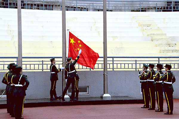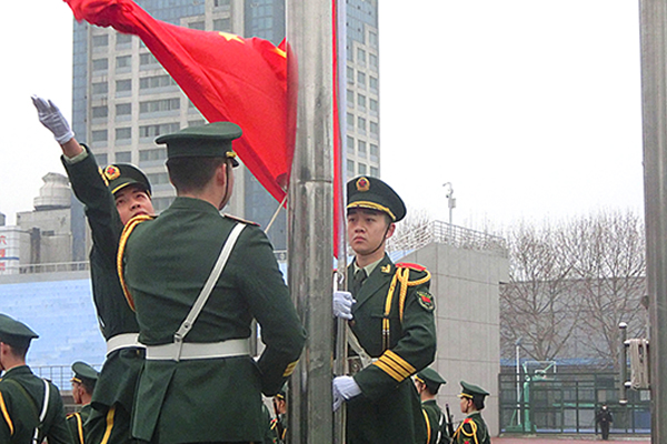 在雄壮的国歌声中,五星红旗冉冉升起,飘扬在美丽校园的上空,现场师生庄严肃立,面向五星红旗行注目礼。