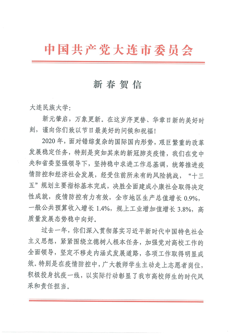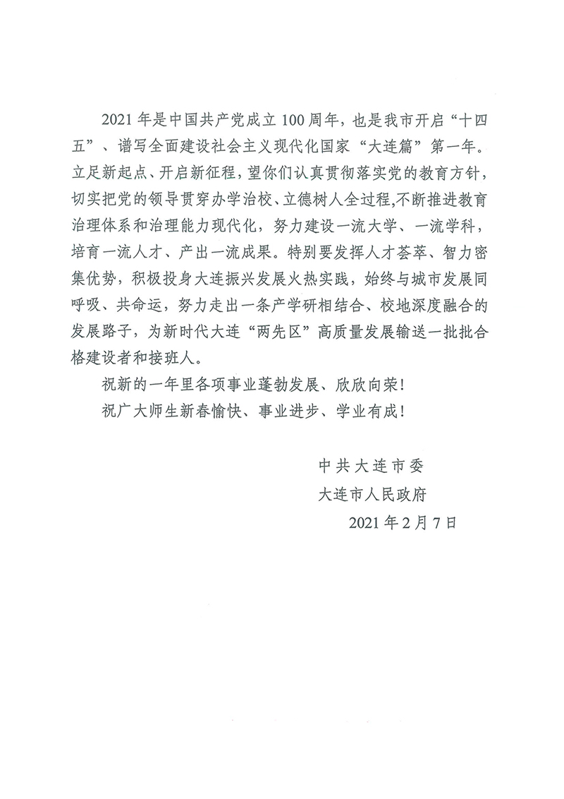 中共大连市委、大连市人民政府致bat365中文官方网站新春贺信
