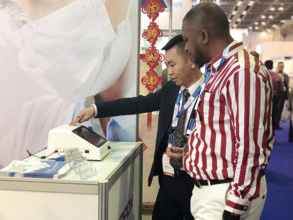 单通道干式荧光免疫分析仪是基于免疫荧光层析技术的POCT产品,POCT(Point-of-Care Testing)是指在病人旁边进行的临床检测及床边检测的新型方法,临床验证表明,该产品具有高灵敏度、结果准确、精密度高、稳定性好、操作简便、报告快速等特点,能广泛应用于新冠的血清、血浆、全血以及咽拭子的样本检测。仪器客观报告待测物含量,以参考值为标准判断是否感染,实现了现场采样,即刻分析,省去标本在实验室检验时的复杂处理程序,能够在低成本条件下完成对疑似和高危人群的大面积筛查和快速甄别。产品首次报告结果可在2~8分钟内完成,可达到每小时120人份的检测通量。该产品已经多次在全球规模的大型医疗展会参展,得到多个医疗厂商的和相关医疗机构的广泛关注。