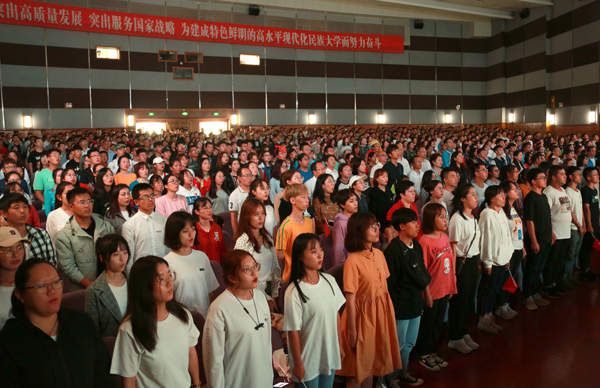 校长 丁克毅:70年来,在中国共产党坚强领导下,我们成功开辟的中国特色社会主义道路,实现了从站起来、富起来到强起来。庆祝大会全方位、多角度展示了“当惊世界殊”的发展成就,让各民族师生倍感振奋、备受鼓舞。进入新时代,学校面临着加快“双一流”建设,实现高等教育内涵式发展的要求,是机遇更是挑战。面对新形势新任务新要求,我们要将建设发展好民族高等教育放在新时代坚持和发展中国特色社会主义的战略高度,全面落实立德树人的根本任务,牢记民族高校办学的初心和使命,坚持“两为”办学宗旨,按照学校第一次党代会描绘的宏伟蓝图,深入落实“三个突出”战略要求,深化“三项重点工作”,抓好“三件大事”,全面实施学科引领、创新驱动、一流本科、人才强校、美丽民大“五项工程”,进一步提升办学水平和办学层次,努力培养造就出更多适应少数民族和民族地区发展的德智体美劳全面发展的社会主义建设者和接班人,为中国特色社会主义事业的发展和中华民族伟大复兴再立新功。