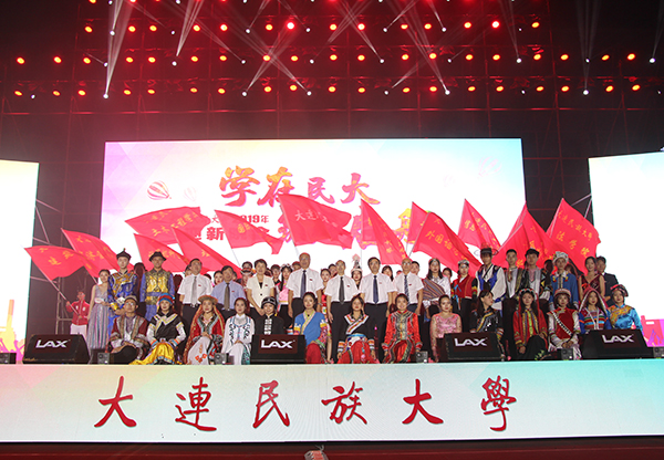 民大新闻网讯 9月1日晚,“学在民大 筑梦启航”2019年迎新晚会在开发区校区体育场隆重举行。党委书记赵铸,党委副书记、校长丁克毅,党委副书记杜元虎,党委副书记、纪委书记刘锐,党委常委、副校长张维民,副校长段晓东,党委副书记、副校长陈明华,党委常委、副校长黄永东,党委常委、总会计师郝强,校学术委员会主任刘勇奎,各学院和相关职能部门负责人、教师代表,2019级全体新生及部分家长共6000余人观看了演出。