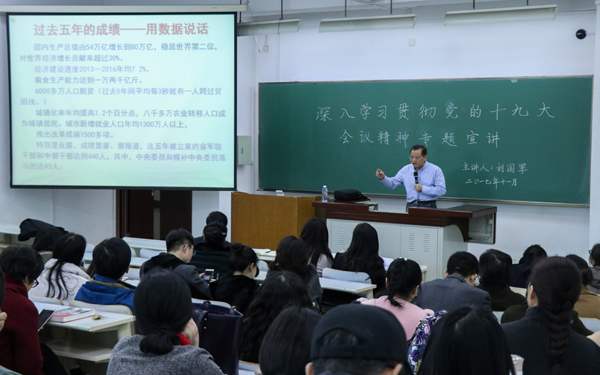 刘国军教授从十九大报告的主题、重大理论创新成果、党的领导和建设问题、教育工作等十二个方面进行了深刻解读,回顾了中国共产党带领全国各族人民在各领域所取得的进步与成就,同时对社会主要矛盾的变化和反映在教育方面的体现,以及十九大报告有关教育工作和民族宗教方面的论述,结合生动实例作了解读,强调新时代要以培养担当民族复兴大任的时代新人为着眼点,高等教育要加快一流大学和一流学科建设,不断推进内涵式发展,要加强师德师风建设,培养高素质教师队伍。为了能更好的学习领悟十九大精神实质,刘教授还向在场教师推荐了相关学习参考资料。