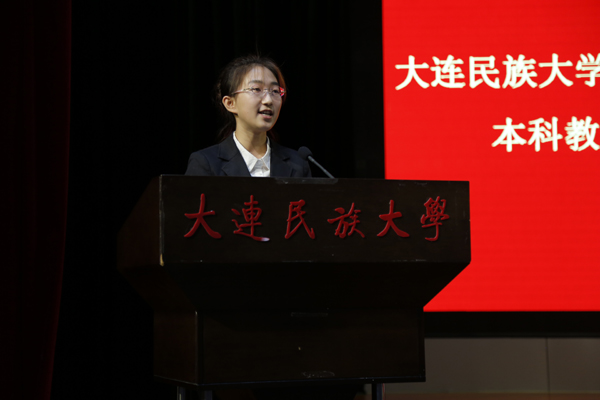 学生会主席张梦真宣读迎接本科教学工作审核评估倡议书,倡议全校学生积极响应“建文明校园,做文明使者”活动,建设良好的学风氛围,创建文明的校园环境,营造优秀的校风,以优良精神面貌迎接审核评估。