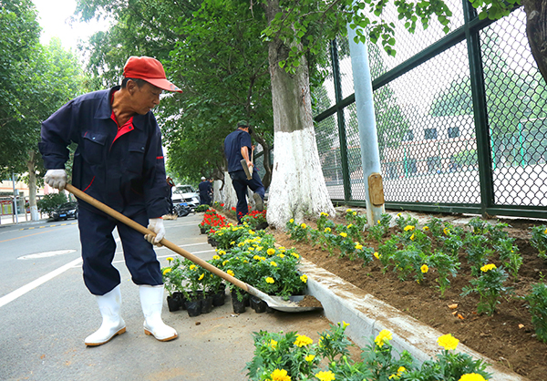 后勤工作人员栽种花草,创造更加优美的校园环境