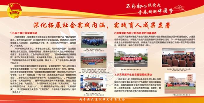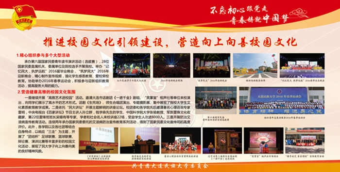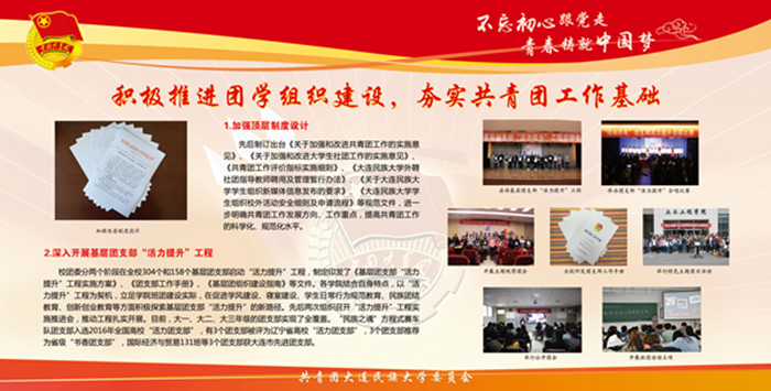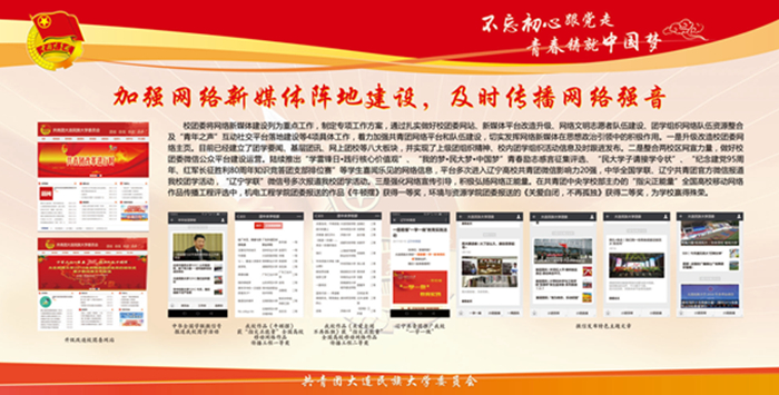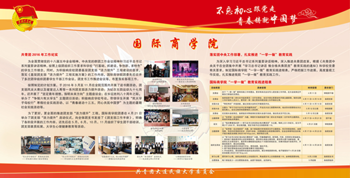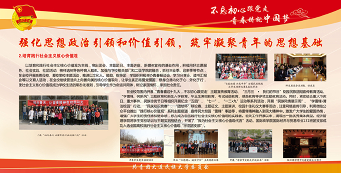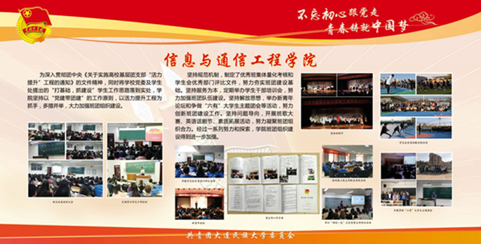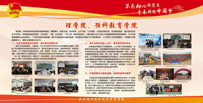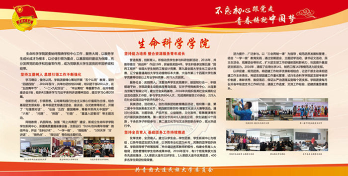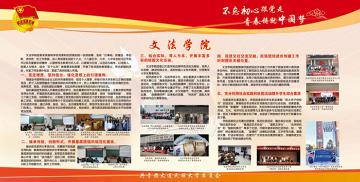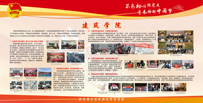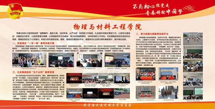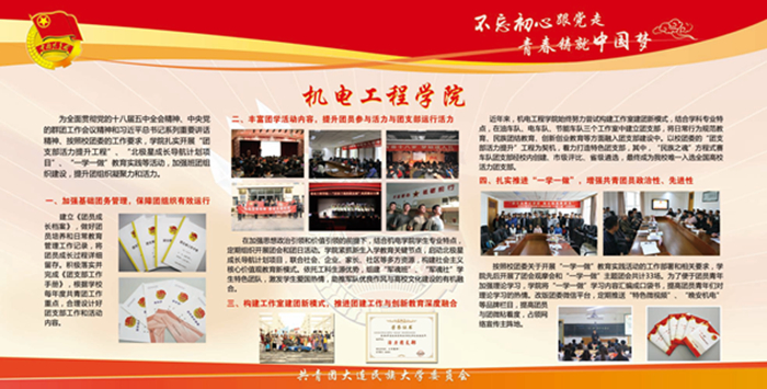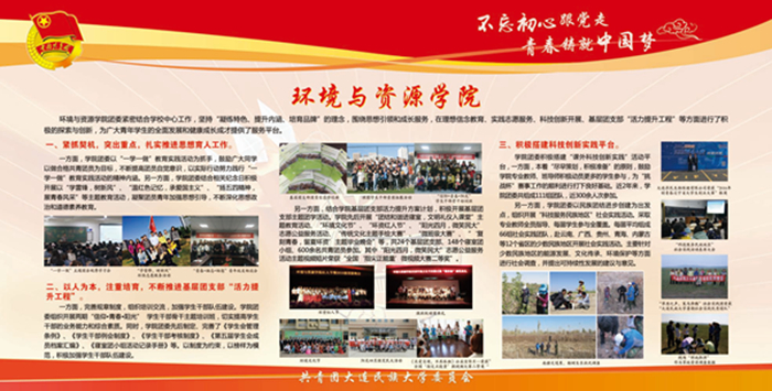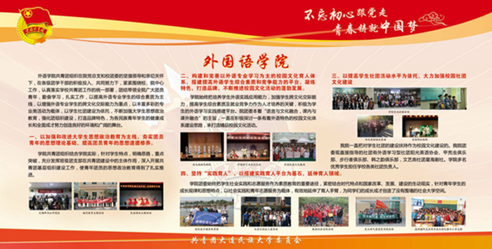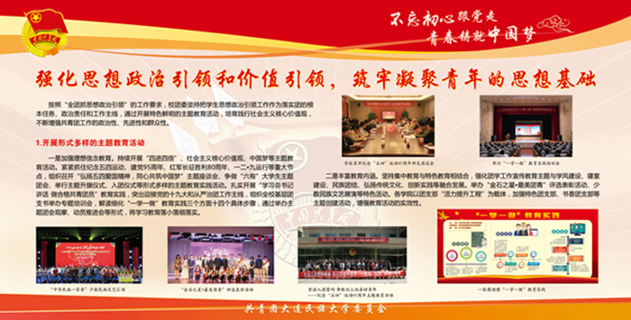 该宣传栏分“强化思想政治引领和价值引领,筑牢凝聚青年的思想基础”“积极推进团学组织建设,夯实共青团工作基础”“组织参与创新创业活动,助力学生成长成才”“推进校园文化引领建设,营造向上向善校园文化”“深化拓展社会实践内涵,实践育人成果显著”“加强网络新媒体阵地建设,及时传播网络强音”及各学院团学工作展示等七大板块,图文并茂,内容丰富,全面展示了bat365各级团组织朝气蓬勃的精神风貌,展现出各民族青年和谐奋进的时代风采。