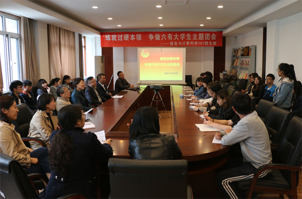 团会首先介绍了“一学一做”教育实践的具体内容,对习近平总书记提出的广大青年一定要“坚定理想信念、练就过硬本领、勇于创新创造、矢志艰苦奋斗、锤炼高尚品格”的五点要求,以及争做“有理想、有追求、有担当、有作为、有品质、有修养”六有大学生的具体内涵进行了讲解。各民族团员代表围绕“练就过硬本领,争做六有大学生”主题,结合自身实际,畅谈大学生活规划、团支部建设、综合能力锻炼和品行修养砥砺,分享入学以来的成长和感悟。信息与计算科学教工党支部的教师代表们分别从专业学习、职业发展和营造积极向上的集体氛围等方面为同学们释疑解惑。校友代表郝长春结合在银行工作的经历,阐述了学习数学所培养的逻辑能力、思维能力在工作中的实际应用,鼓励学弟学妹们学好专业课程,广泛涉猎课外知识,注重人际交往,珍惜大学生活。党总支书记刘满谈到,信息161班团支部是一个充满阳光和活力的集体,希望同学们能够练就过硬的专业本领,团结互助,脚踏实地,为理想和追求不懈努力。