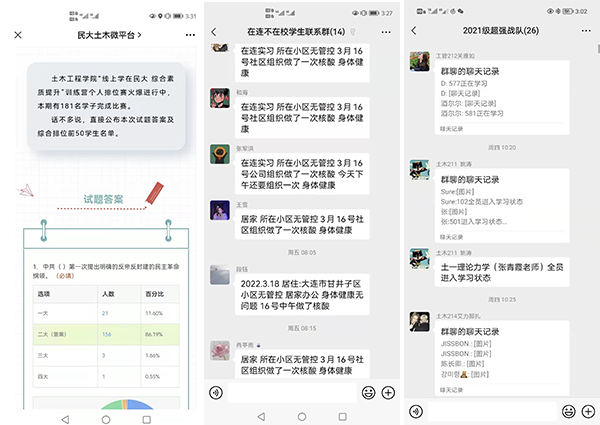 土木工程学院从3月16日起开始开展线上“学在民大” 综合素质提升训练营,面向全体学生,通过辅导猫发布涵盖党史知识、专业知识、疫情防控、网络安全、传统文化、冬奥会等相关内容试题,每周三、周五晚8点举办,第一期共有205名学生在规定时间内完成答题,11名学生取得满分。
