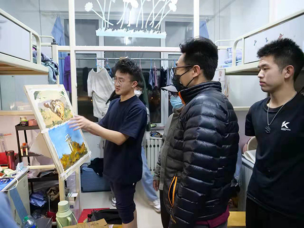 设计学院党委组织学生党支部设立责任区,由学生党员、学生入党积极分子、学生干部组成的76人志愿服务队,着力当好宣传员、监督员、劝导员、代办员,共同维护校园疫情防控安全。教师党支部组织全体留校党员教师每天坚持深入一线、深入寝室、深入课堂,与学生沟通交流,架起了一座牢固的“心与心”桥梁。