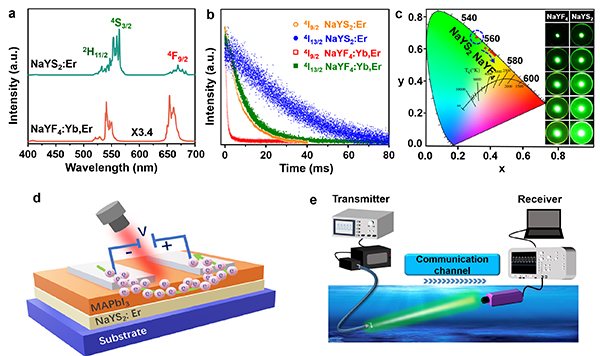 上转换发光材料已被广泛应用于信息安全、三维显示、高分辨成像及光通信等领域,目前最高效的商业稀土上转换发光材料(NaYF4:Yb,Er)被发现至今已有50余年,但有效激发波长一直局限于980 nm。针对长期以来上转换发光材料激发波长受限且发光效率低的瓶颈问题,董斌教授科研团队选取声子能量低、晶格对称性低、共价性强的层状三元稀土硫化物作为基质,利用该材料体系中Er离子4I15/2-4I13/2跃迁吸收截面大、4I9/2能级寿命长(~10 ms)的双重优点,发明了基于Er离子自敏化上转换发光的新技术,发现了低光子能量激发实现高效稀土上转换发光的新方法。团队成功研发出C波段激光(1532 nm)激发的高效稀土上转换发光材料(NaYS2:Er),该材料的发光亮度、光谱稳定性、热稳定性均优于NaYF4:Yb,Er,在窄带光探测及无源水下光通信等领域显示出极强的应用潜力。此外,由于C波段位于人眼安全波长,采用该波段激发光源可显著提升安全性,降低应用场合的防护等级,从而大幅减少应用成本,有望全方位升级取代目前商用的NaYF4:Yb,Er,进一步拓展材料应用空间。