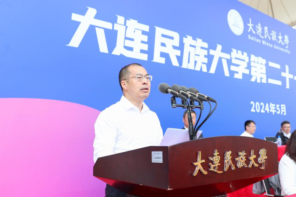 丁克毅在致辞中代表学校党委向运动会的召开表示热烈祝贺。他表示,过去一年来,在国家民委党组和地方党委政府的正确领导下,学校党委深入学习贯彻习近平新时代中国特色社会主义思想,团结带领广大师生员工,蓄势聚力,攻坚克难,推动改革发展和转型升级,取得了一系列新成效、实现了一系列新突破。在体育教育上也实现了学生身体素质增强和体育竞技水平提升的“双丰收”。这些成绩凝聚着每一个民大人的付出,是大家一起拼出来、干出来、奋斗出来的!这些成绩的取得,也更加坚定了我们建设高水平现代化综合大学的信心和决心。一年一度的运动盛会,是温暖的相聚,将团结友爱深深地镌刻在每个人的心头。不断向前奔跑,是大连民大一直以来的发展状态,也是每个民大人最好的人生状态,希望广大师生要始终团结向上、自信自强,以铸牢中华民族共同体意识为主线,深入实施学校“四个突出”战略,保持加速奔跑的好状态,干出争先进位的新气象,以实际行动和优异成绩迎接学校第二次党代会胜利召开!