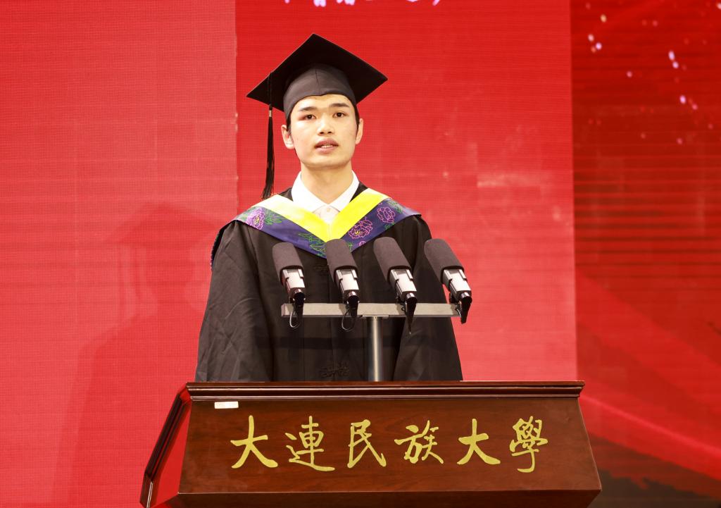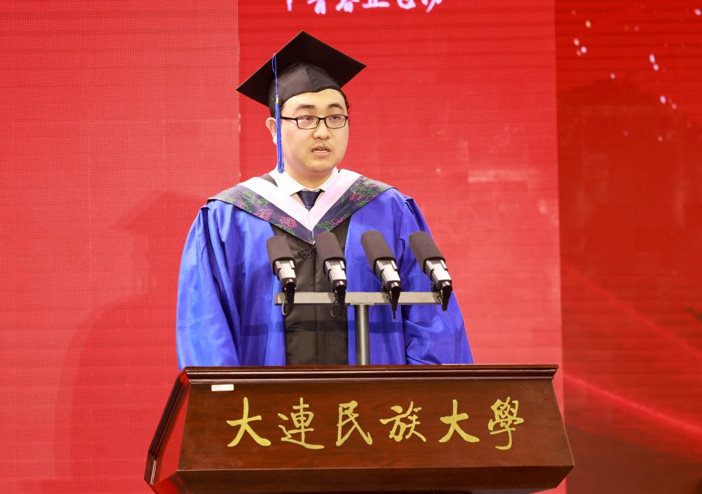 研究生代表、民族学一级学科、中华民族共同体研究院(学院)孟鑫回顾了在民大七年,从一名英语专业本科生成为民族学研究生的成长点滴,将谨记母校嘱托,成为具有民族团结基因和铸牢中华民族共同体意识的优秀人才。