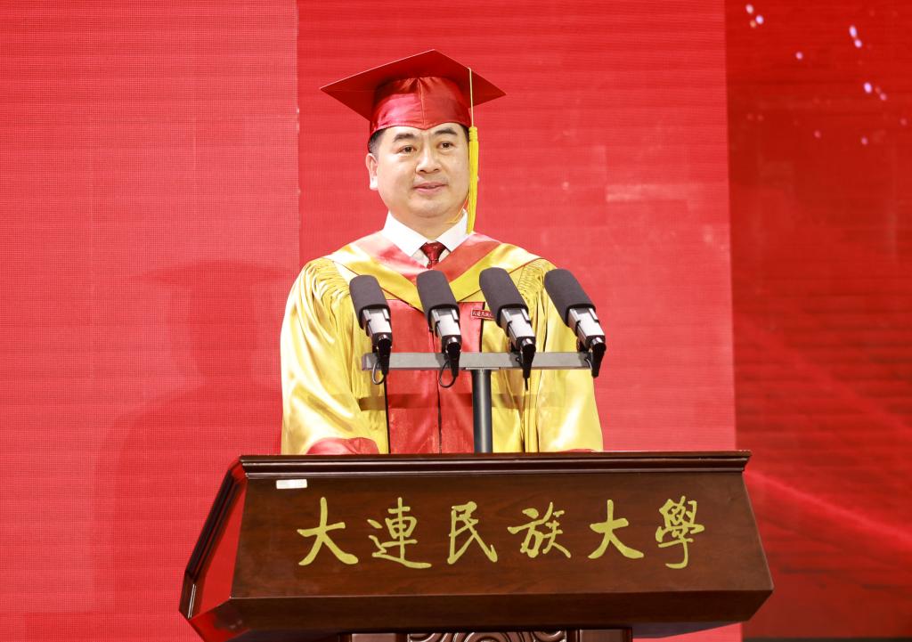 赵立涛代表学校党委和全校教职员工向2025届全体毕业生致以热烈的祝贺,向悉心培育学子的老师和家长表示崇高的敬意。他表示,在民大这几年,2025届毕业生与母校相互成就,双向奔赴,共同见证了党的二十大擘画的宏伟蓝图,迎来了中国式现代化新征程的全面开启。学校去年被党中央、国务院授予“全国民族团结进步模范集体”,成为近四次表彰全国唯一蝉联高校。这几年,学校在以铸牢中华民族共同体意识为主线,全面推进高水平现代化综合大学新征程上不断取得新的突破和新的成绩,学校发展迈入历史上最好的时期。学校的发展画卷中闪耀着2025届毕业生朝气蓬勃的身影,留存了美好青春印记。