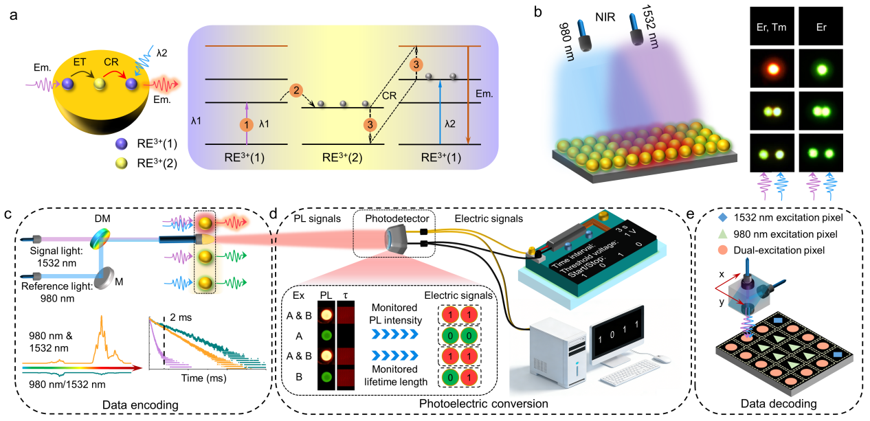镧系掺杂上转换发光在超分辨成像、三维显示与信息安全等领域具有重要应用价值。然而,镧系离子能级结构复杂导致电子布居过程难以调控,实现上转换发光的动态操纵仍是该领域的关键挑战。为此,bat365物理与材料工程学院研究团队与哈尔滨工业大学合作,创新提出一种双波长协同激发策略,通过直接操控离子间的交叉弛豫过程,实现了对上转换发光的动态与精准调控。研究采用具有独特层状结构、超长激发态寿命及低声子能量的NaYS2为基质,借助双波长激发定向调控交叉弛豫路径,在Er3+-Ln3+(Ln3+= Tm3+, Ho3+, Yb3+)体系中实现了目标激发态的选择性布居。该方法不仅将红色上转换发光增强约20倍,还实现了红-绿发光颜色的动态切换。在此基础上,进一步构建了光学逻辑门与动态随机视觉加密系统,为光学信息安全领域的实际应用提供了新的研究思路。