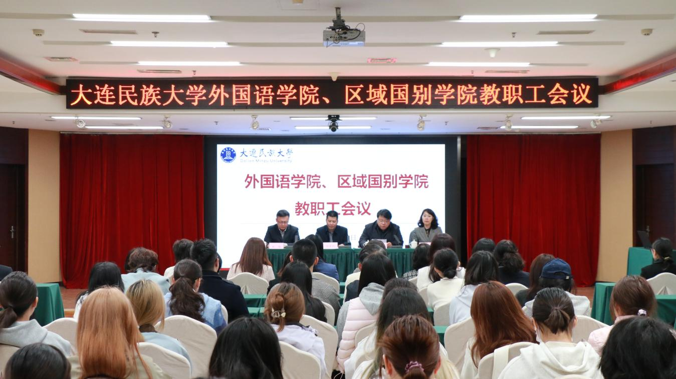 外国语学院、区域国别学院班子成员和全体教职工以及学生代表参加会议。