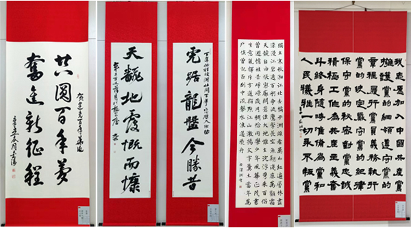 本次师生书法作品展由党委宣传部、党委学生工作部共同主办,校书法教育研究会承办,共计收到156幅投稿作品,经筛选评审,最终展出篆书、隶书、楷书、草书、行书5类书体共计48幅作品。作品立意新颖、格调高雅、主题突出、特色鲜明,广大师生积极踊跃参与本次活动,在创作中进一步加深对知史爱党、知史爱国的理解,增强守初心、担使命的思想自觉和行动自觉。