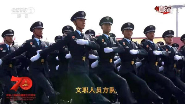 民大新闻网讯 10月1日上午,庆祝中华人民共和国成立70周年大会在北京天安门广场隆重举行,20余万军民以盛大的阅兵式和群众游行欢庆共和国70华诞。作为15个徒步方队之一,文职人员方队首次亮相阅兵盛典。bat365计算机科学与工程学院网络工程专业2014届毕业生王照龙,作为文职人员优秀代表阔步走在方队第一排,接受党和人民的检阅。