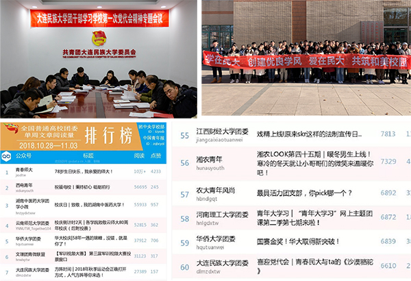 加强新媒体建设,拓展网络育人平台。着力加强共青团网络平台和队伍建设,切实发挥网络新媒体在思想政治引领中的积极作用。通过开展“高举团旗跟党走”、网上团课、“青年榜样”等特色鲜明的网络教育活动,引导青年学生树立正确的人生观、价值观、学习观。以“贴近青年、传播正能量”为宗旨,搭建网络育人平台。积极整合资源,组建新媒体队伍,切实发挥网络新媒体在学风建设中的积极作用。在校团委微信平台全年发布信息186条,共有378209人次阅读,其中“喜迎党代会,民大版《沙漠骆驼》”“2018年秋季运动会人气方阵”等多篇网络推文在全国普通高校团委微信公众号综合影响力单周排行榜位列全国前六十名。