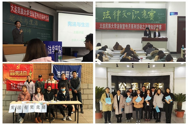 贴近大学生活,解决实际问题。为迎接全国宪法日的到来,11月18日,面向全校进行“宪法与生活”主题法律征文活动,共征集作品50余篇;12月1日,邀请法律系专业教师任峰为学生做了“宪法与生活”主题讲座,就我国宪法的发展史、宪法日的来源及其设立意义、宪法与日常生活的密切关系等作了详细讲解,让在场学生深刻懂得了学习宪法、理解宪法、遵守宪法的深刻内涵;12月2日,法学研究会成员举办“法律诊所”活动,为同学们解答发生在生活中的法律疑问,同时通过法律知识竞答、发放宪法宣传册等方式,向同学们普及法律知识,加深同学们对宪法的了解。
