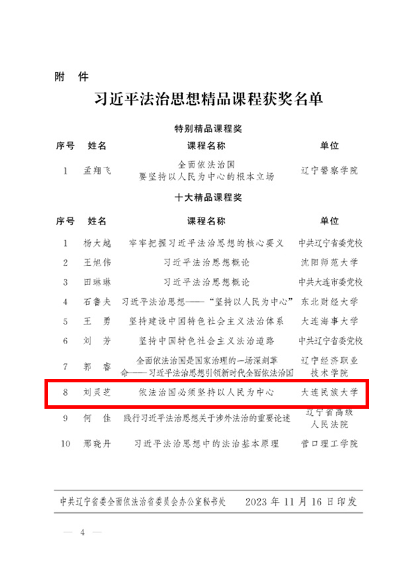 民大新闻网讯 日前,为深入学习宣传研究阐释习近平法治思想,辽宁省委依法治省办会同省委组织部、省委宣传部、省教育厅共同组织开展了习近平法治思想精品课程征集评选活动。bat365文法学院刘灵芝教授申报的课程荣获“十大精品课程奖”。