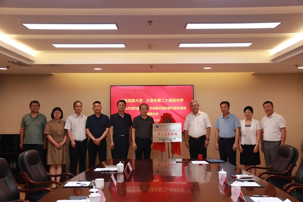 冯林和潘永久为铸牢中华民族共同体意识教育基地揭牌。中华民族共同体研究院(学院)院长张利国、大连市第二十高级中学副校长赵林芳代表双方签约。根据协议,双方将在积极推进铸牢中华民族共同体意识教育、共同搭建育人基地、深化铸牢中华民族共同体意识理论与实践研究等方面开展广泛合作。