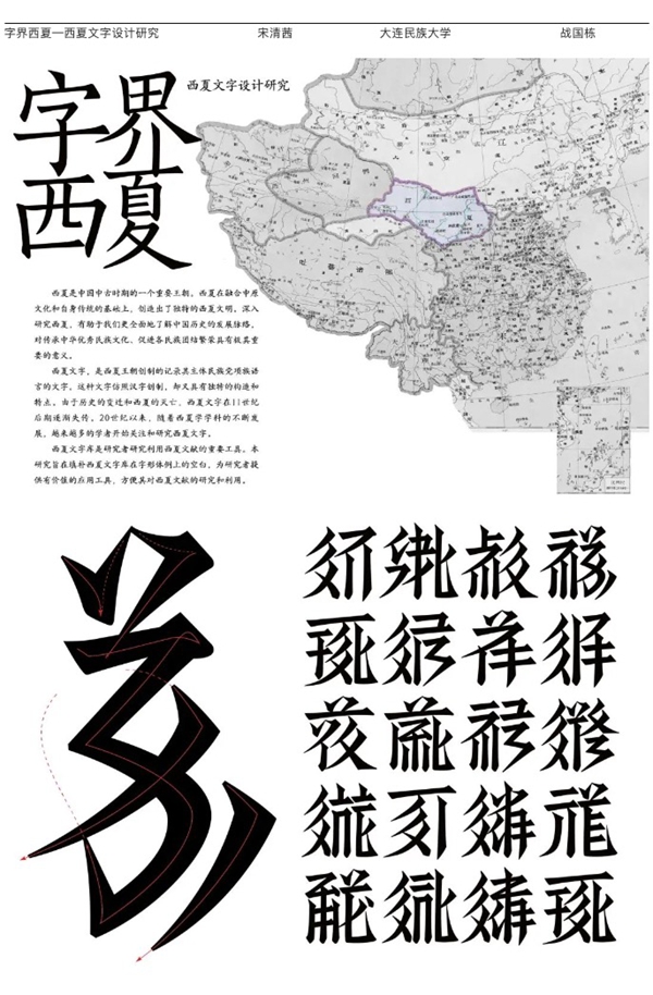 宋清茜的作品聚焦中国西夏文,以古文字为灵感源泉,结合现代设计理念,创造出一款既保留了传统韵味又符合当代审美的新型西夏文字体,在两项大赛中脱颖而出。字体不仅丰富了西夏文字表现形式,更是从设计的角度为古籍文献的研究与保护做出的探索与尝试,为铸牢中华民族共同体意识、保护传承中华优秀传统文化贡献了民大力量。