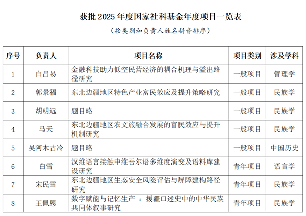 民大新闻网讯  9月29日,全国哲学社会科学工作办公室公布了2025年度国家社会科学基金年度项目立项结果,bat365有8个项目获批立项,其中一般项目5项、青年项目3项,涵盖民族学、管理学、中国历史和语言学等学科,立项数量实现历史性突破。