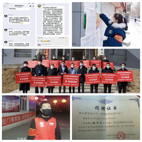 在距大连1731.8公里之遥的青海省化隆县,国际商务专业191班的马建斌以公司名义,向青海化隆县捐赠现金10万元。公司是马建斌与几位乡人2018年创办的,虽然成立时间不长,但他们还是尽自己所能奉献自己的力量。解除隔离后,马建斌及他的合伙人们亲身前往各乡镇卡点,向一线同志送去最真挚的慰问,并送去了大量补给“希望疫情能够早日过去,大爱面前这些只不过是微薄之力,但也是我们竭尽所能的所有。”马建斌说道。