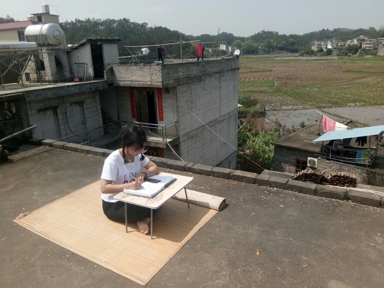 戴凤枚家在广西藤县农村,因为家里没有装宽带,4G信号又时断时续,为了完成这个目标,从学校网课开课的第一天,她就把书桌搬上了自家屋顶。