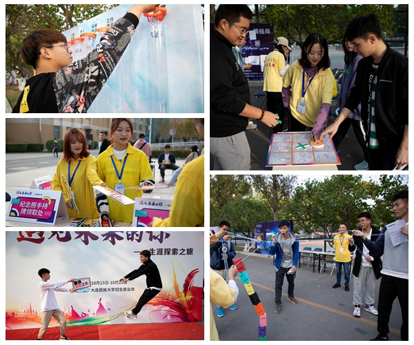在开发区校区太阳鸟礼堂东侧区域,竖立着很多个标有职业价值取向的篮筐,学生将标有自己职业价值观的小球投进自己喜好的篮筐中,通过小球的数量,可以直观地看出自己的价值取向。在篮筐的不远处,“民大情报局”的游戏墙前人山人海,学生们只需扫描二维码,就能看到历届民大毕业生的就业去向以及职业规划。